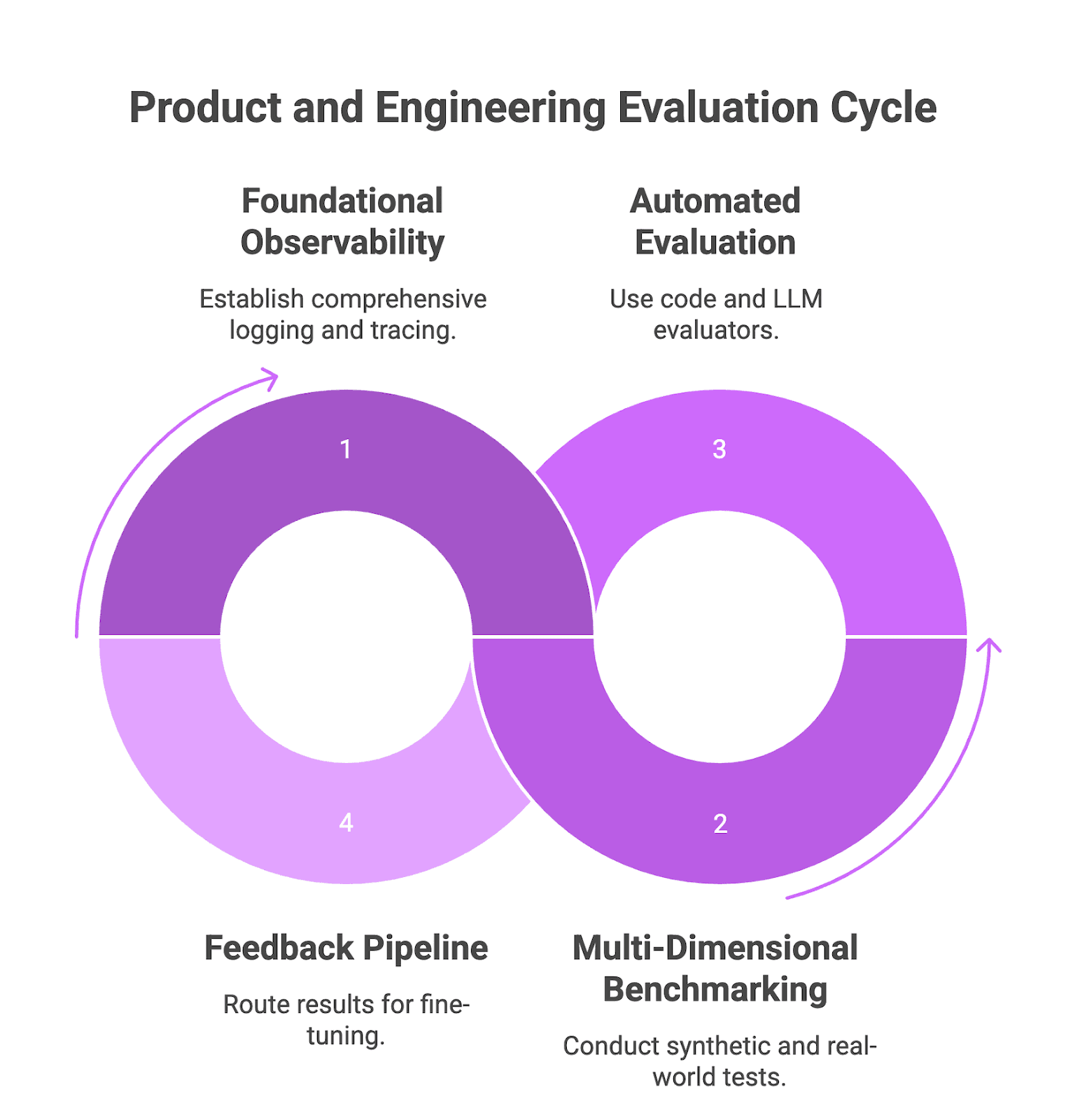 - Engineering Sets Up: Engineers create code-based evaluators to check for technical correctness, such as proper JSON formatting, adherence to API schemas, and factual consistency against a database.