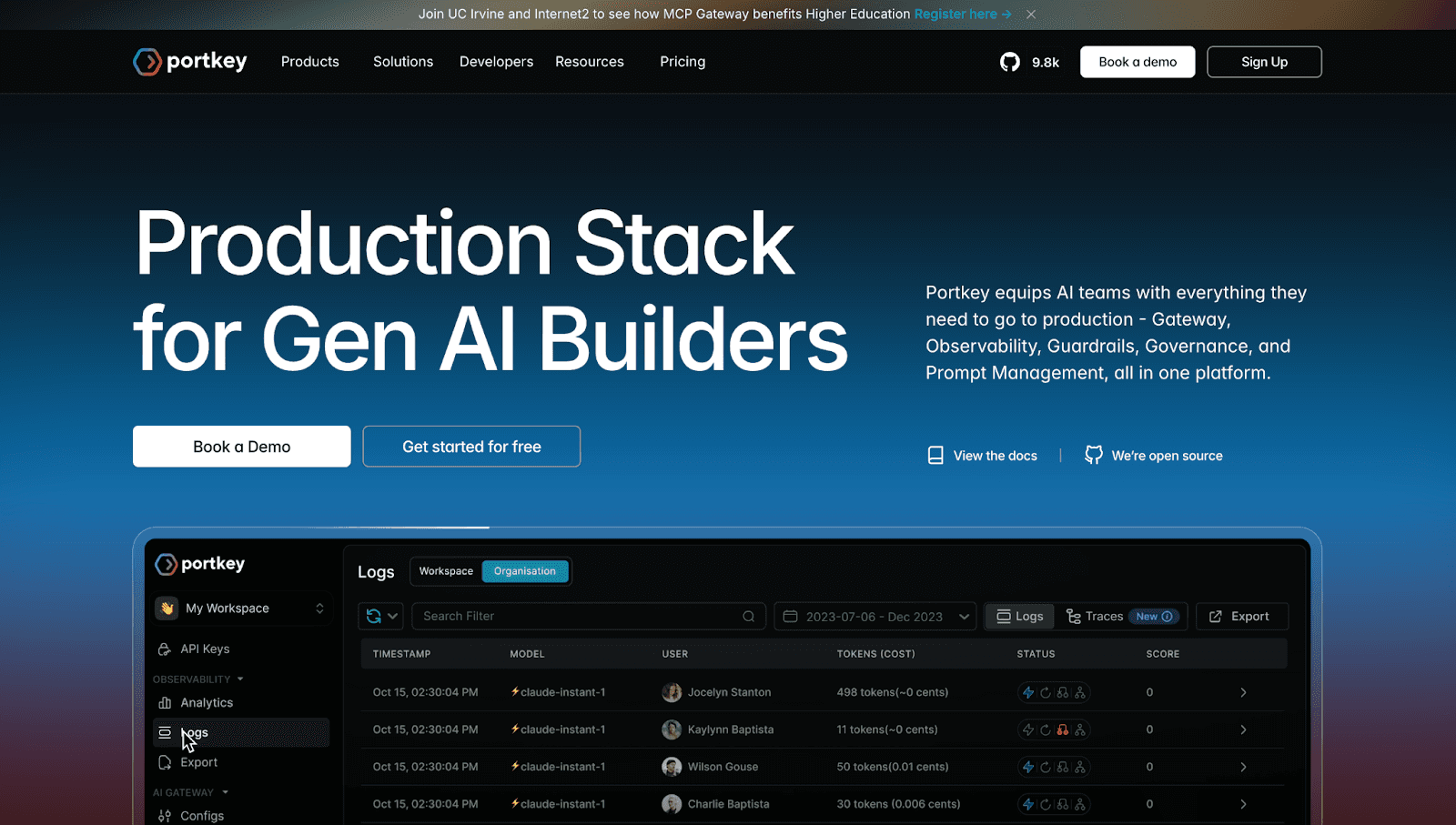 Integrated Observability: Portkey includes a real-time monitoring dashboard to track LLM behavior, detect anomalies early, and manage usage proactively across all requests.