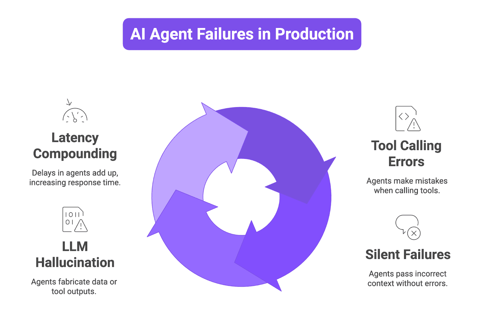 Silent failures in multi-agent systems are harder to catch. Agent A passes context to Agent B, but the context is incomplete or irrelevant. Agent B produces a confident but wrong response. No error is thrown. No exception is logged. The user just gets a bad answer, and your monitoring dashboard stays green.